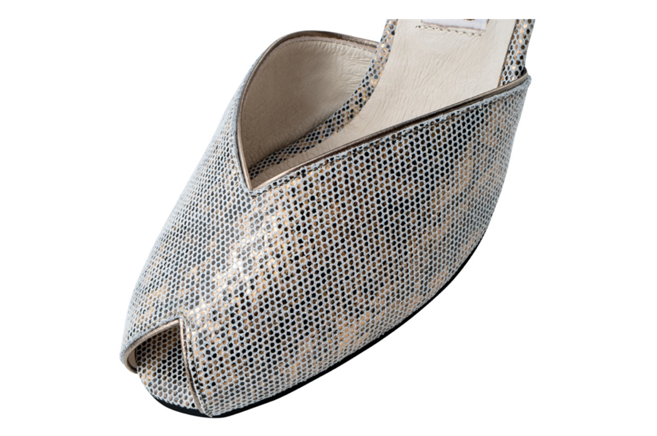 Material: Handschuhweiches, bedrucktes, hochwertiges Velourleder, das in einem Mix aus Gold, Altsilber und Platin schimmert und sich besonders geschmeidig dem Fuß anpasst