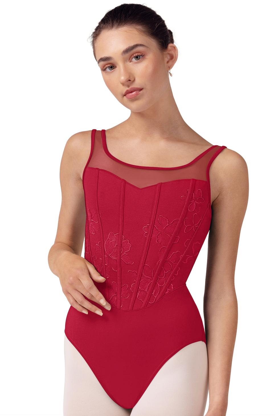 Dieses Bloch Trikot verfügt über weiche Mesh-Einsätze, die den romantischen herzförmigen Ausschnitt betonen, bequeme Träger und ein aufwendig besticktes Korsett-Vorderteil